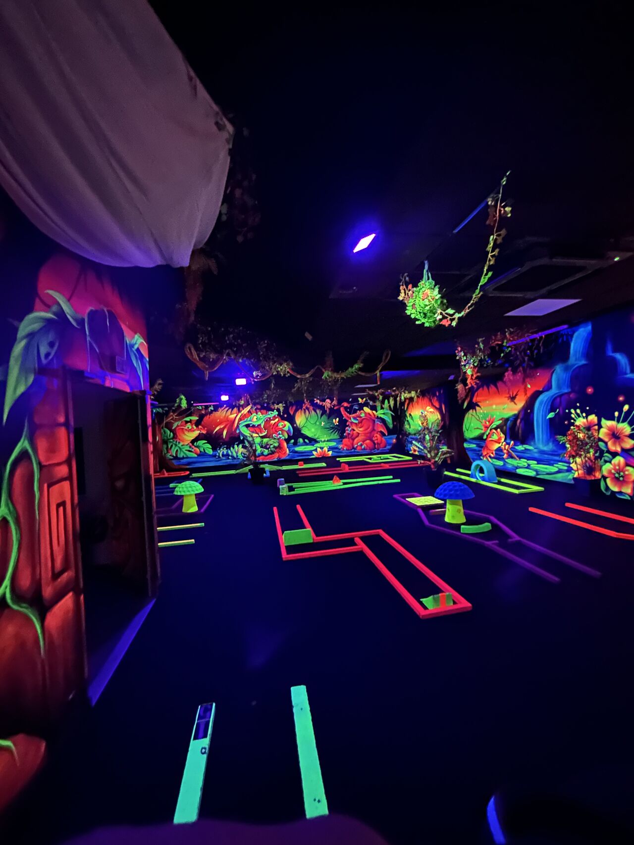 Notre mini-golf d’intérieur fluorescent et hors du commun vous transportera dans un monde coloré et magique.