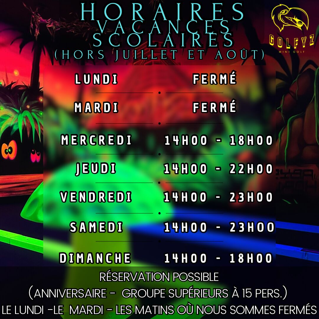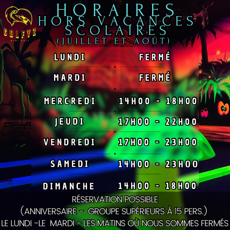 Réservation par téléphone – 03 56 58 51 58 par mail – Golfyz54@gmail.com